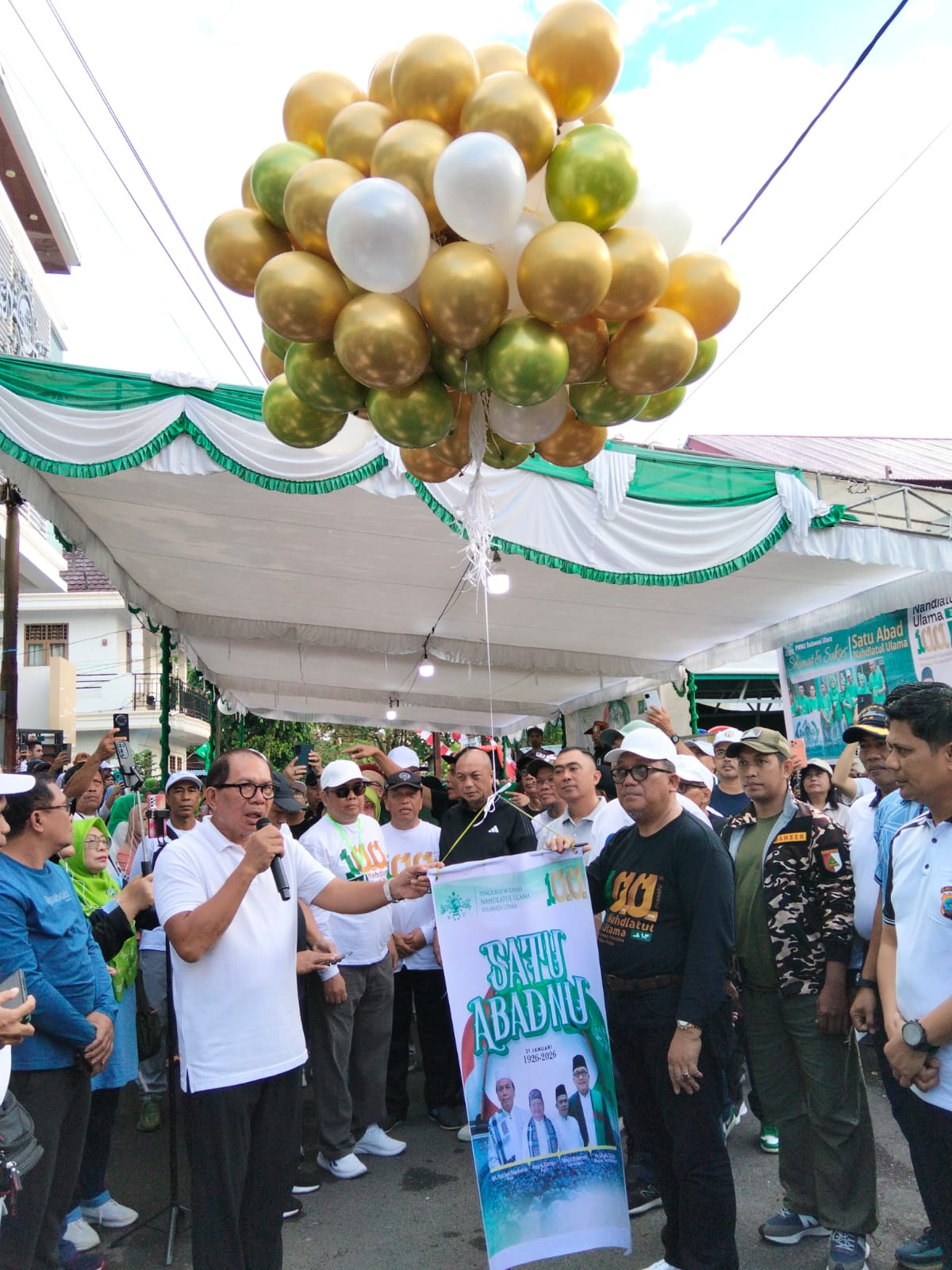 Jalan sehat yang mengambil Start didepan kantor PWNU SULUT, tepat pukul 07.00 ditandai dengan melepas balon warna warni oleh Gubernur Sulut yang diwakili Kadis PMD Darwin Muksin.